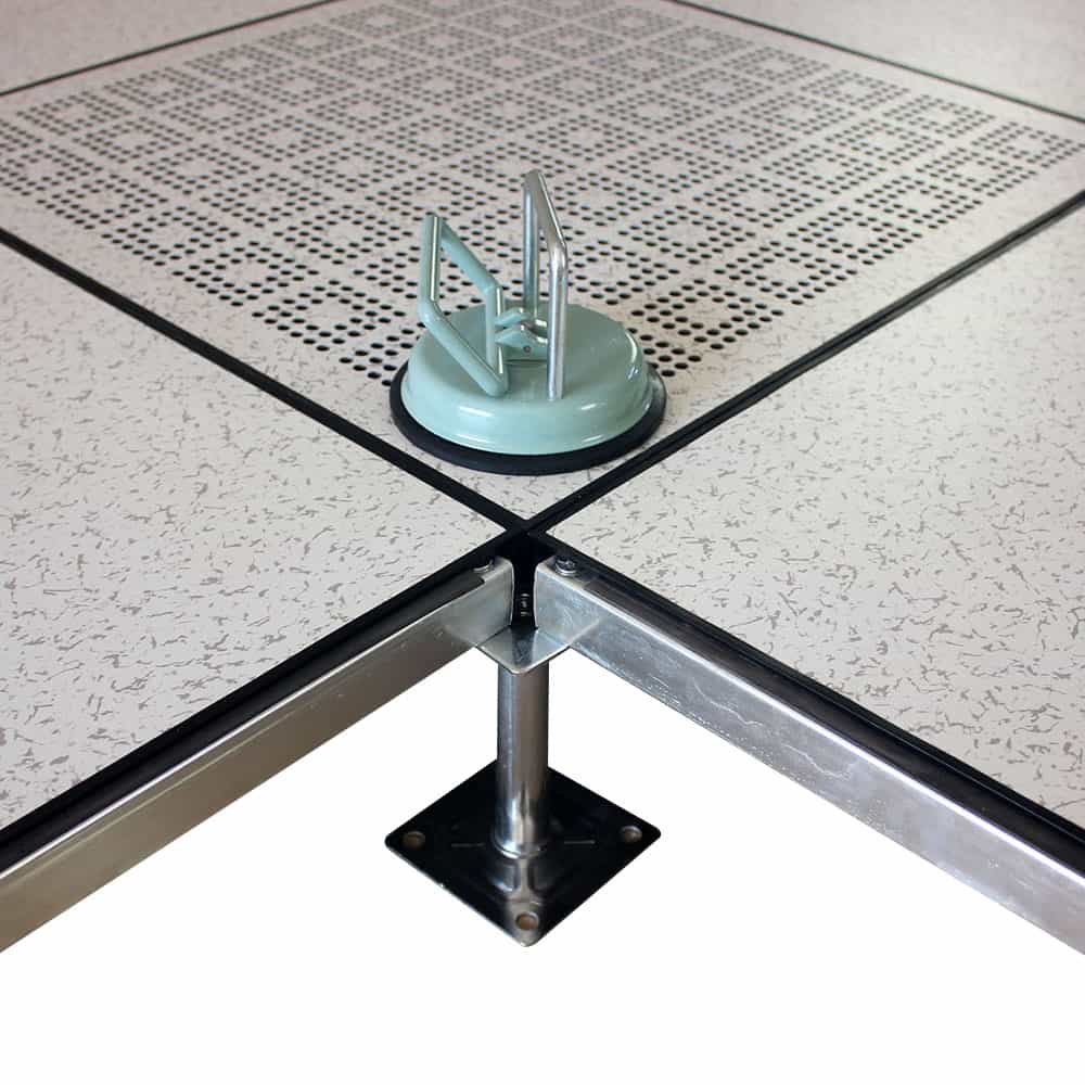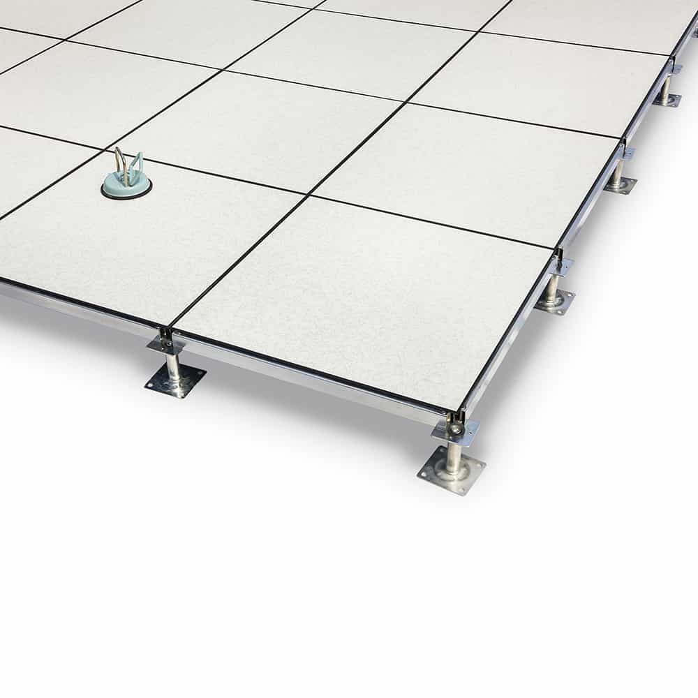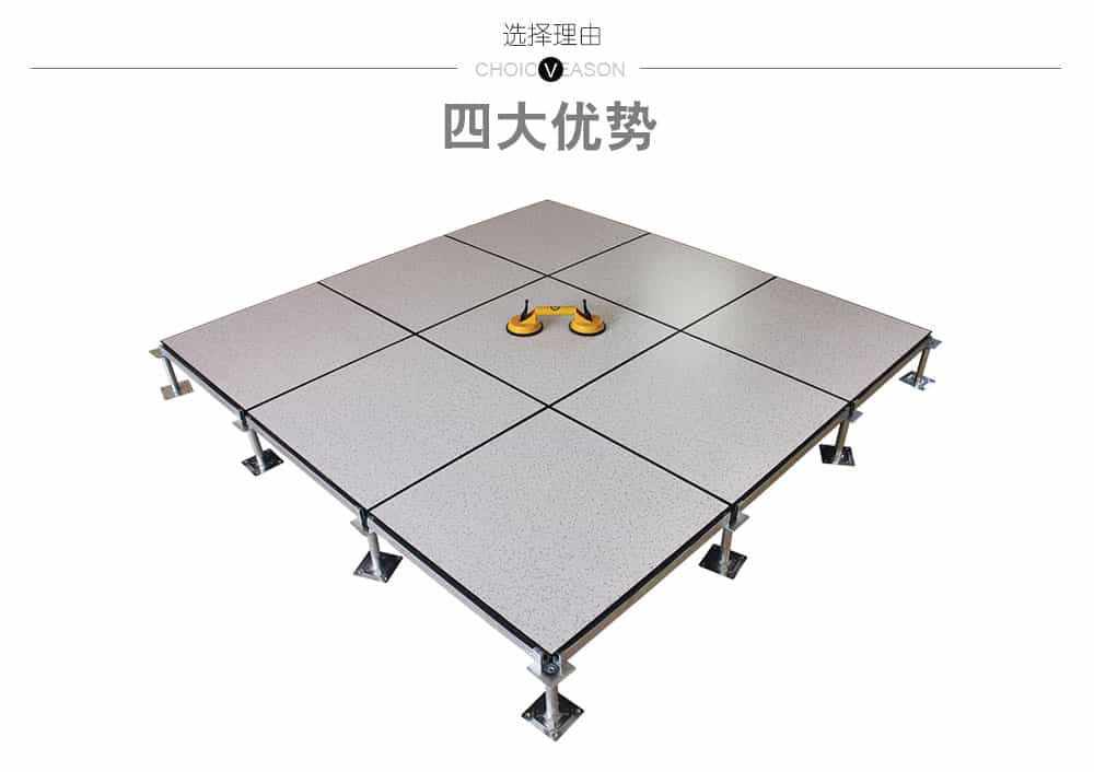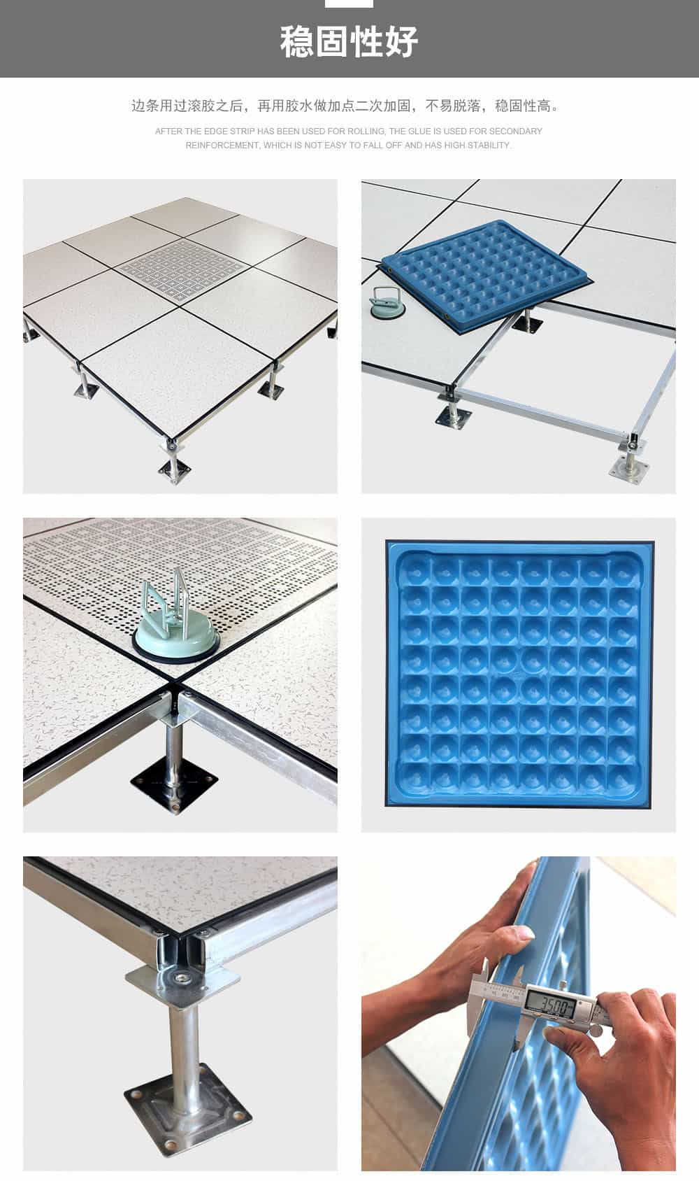 全鋼防靜電地板為全鋼組件,分有邊、無邊、微邊(三種邊處理方式)。底面采用SPCC深沖冷軋板拉伸成型鋼板厚度(0.4~1.5mm),球窩狀結構,增加地板的機械荷載強度。面板采用硬質SPCC鋼板(0.5~2.0mm),上下經過點焊焊接成型,切邊沖孔后,經防銹處理,環氧樹脂粉末靜電噴涂后,中間填充發泡水泥(可以根據客戶需求發泡不同重量),再經過日曬養護后形成穩定的承載結構。地板上表層粘貼防火板(HPL)/復合PVC/ 通體PVC/陶瓷地磚等不同材質的裝飾表層,達到產品花色的多樣性、可以根據客戶需求個性化定制產品。搭配聯網支架、支架、螺釘組裝后,定位聯接更加準確、精度可靠。