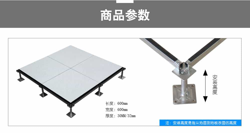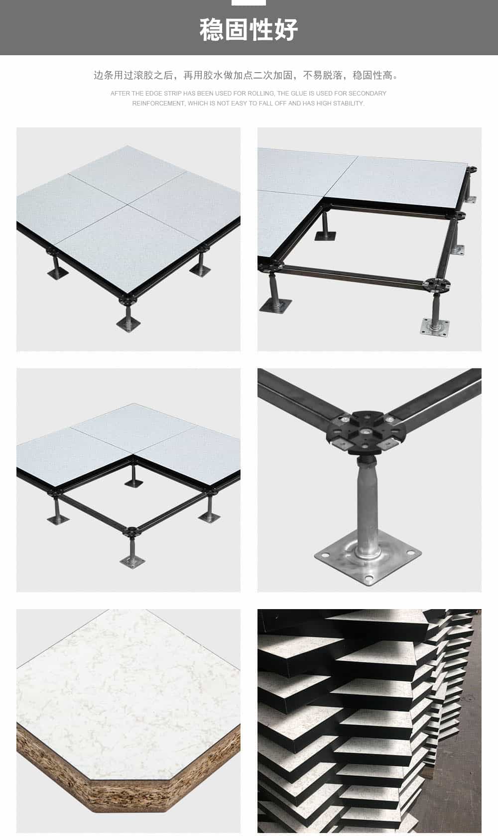 歐式復合地板,板芯采用、未經加工的中高密度刨花板基,上面粘貼HPL(防火板)、PVC、陶瓷、等不同裝飾面層,下面粘貼鍍鋅鋼板/鋁板/鋁箔,四周導靜電黑膠條封邊,阻止機械損壞及潮濕變形。通過阻燃劑的添加,使其達到B1級防火,且具有較輕的自重,達到更高的承載能力和環保水平,標配出口型加重配件。